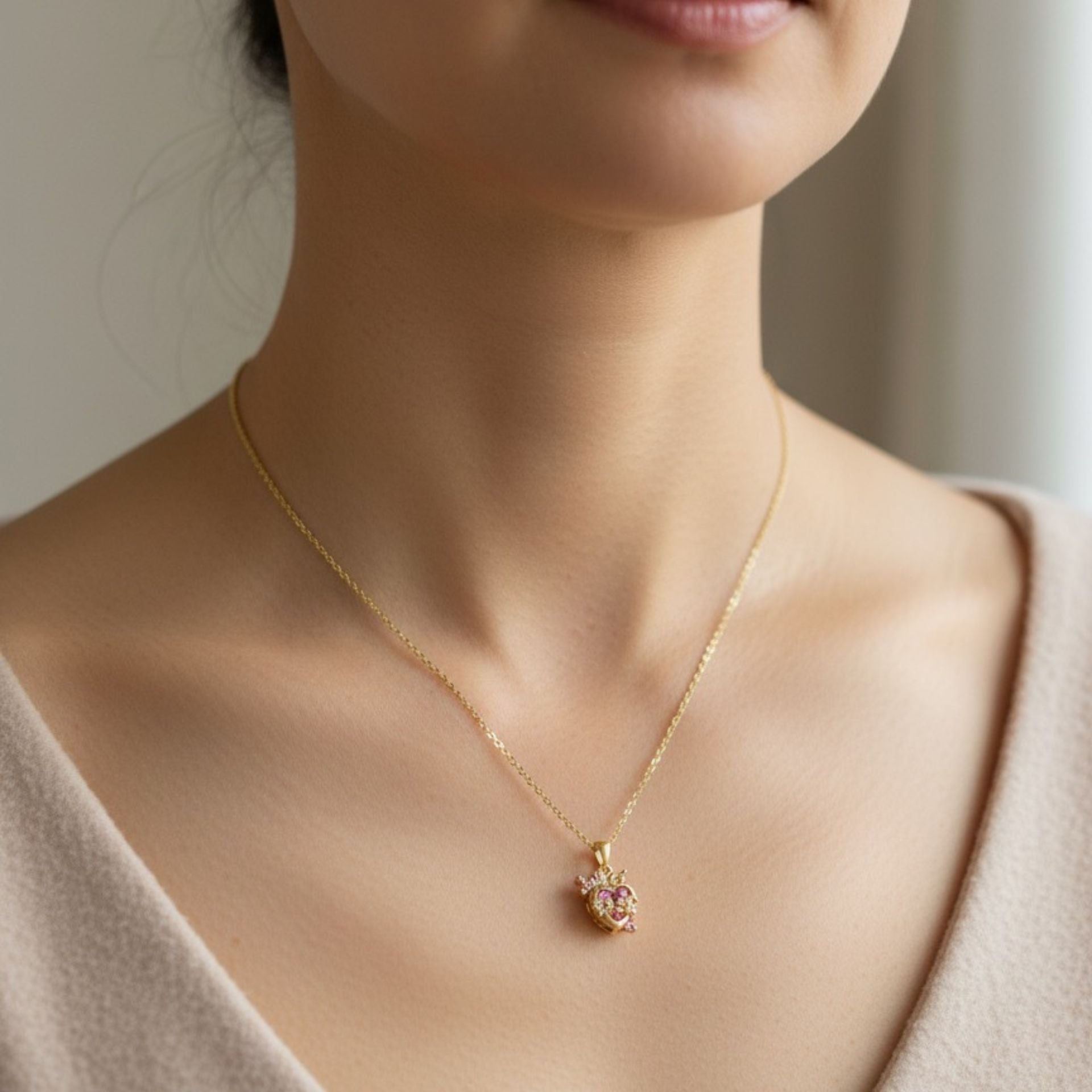 Un collar lleno de significado, con un corazón fucsia atravesado por una espada que representa fuerza interior y valentía. Las pequeñas flores que lo rodean evocan esperanza y ternura, mientras las llamas que lo coronan simbolizan luz, renovación y la capacidad de transformar cada experiencia.