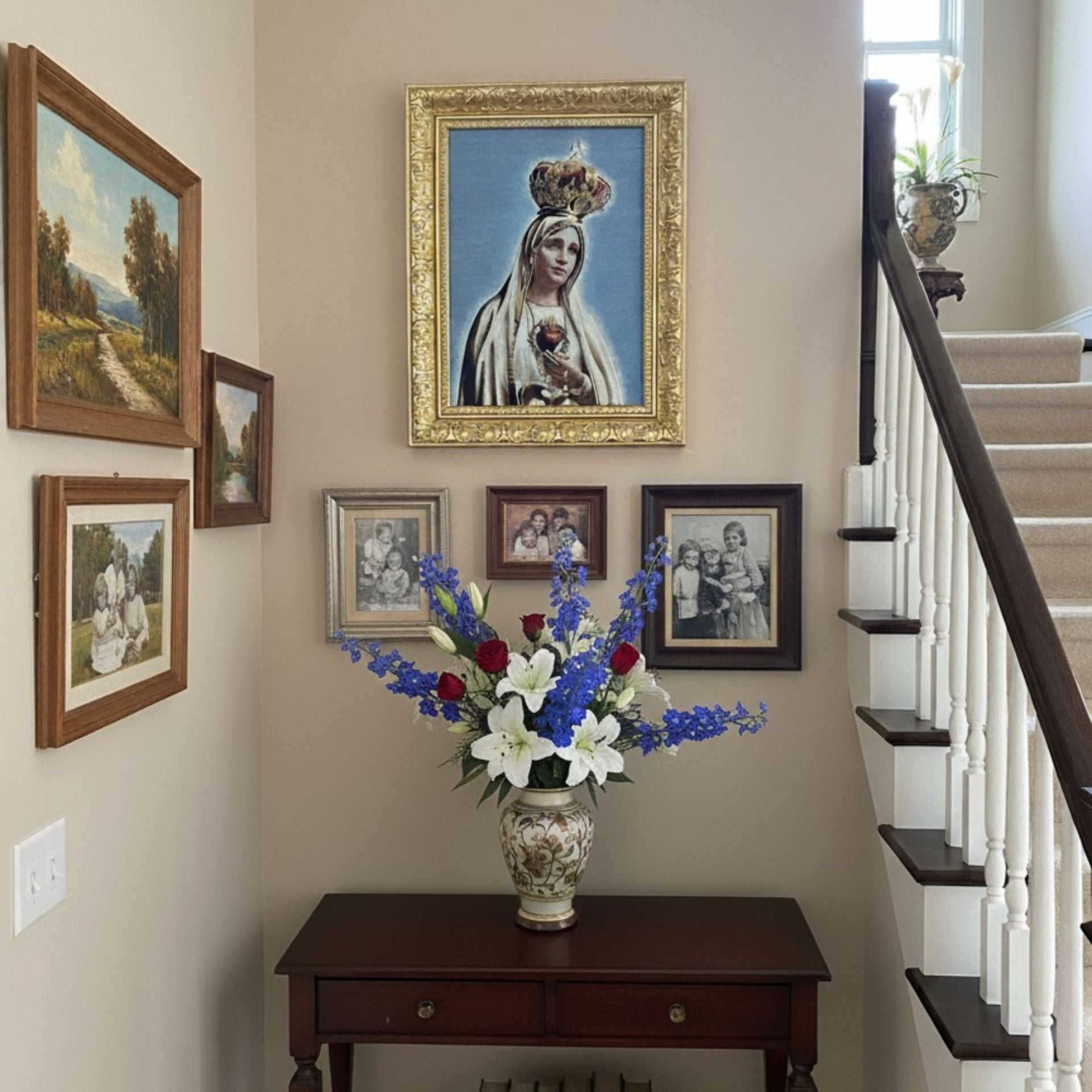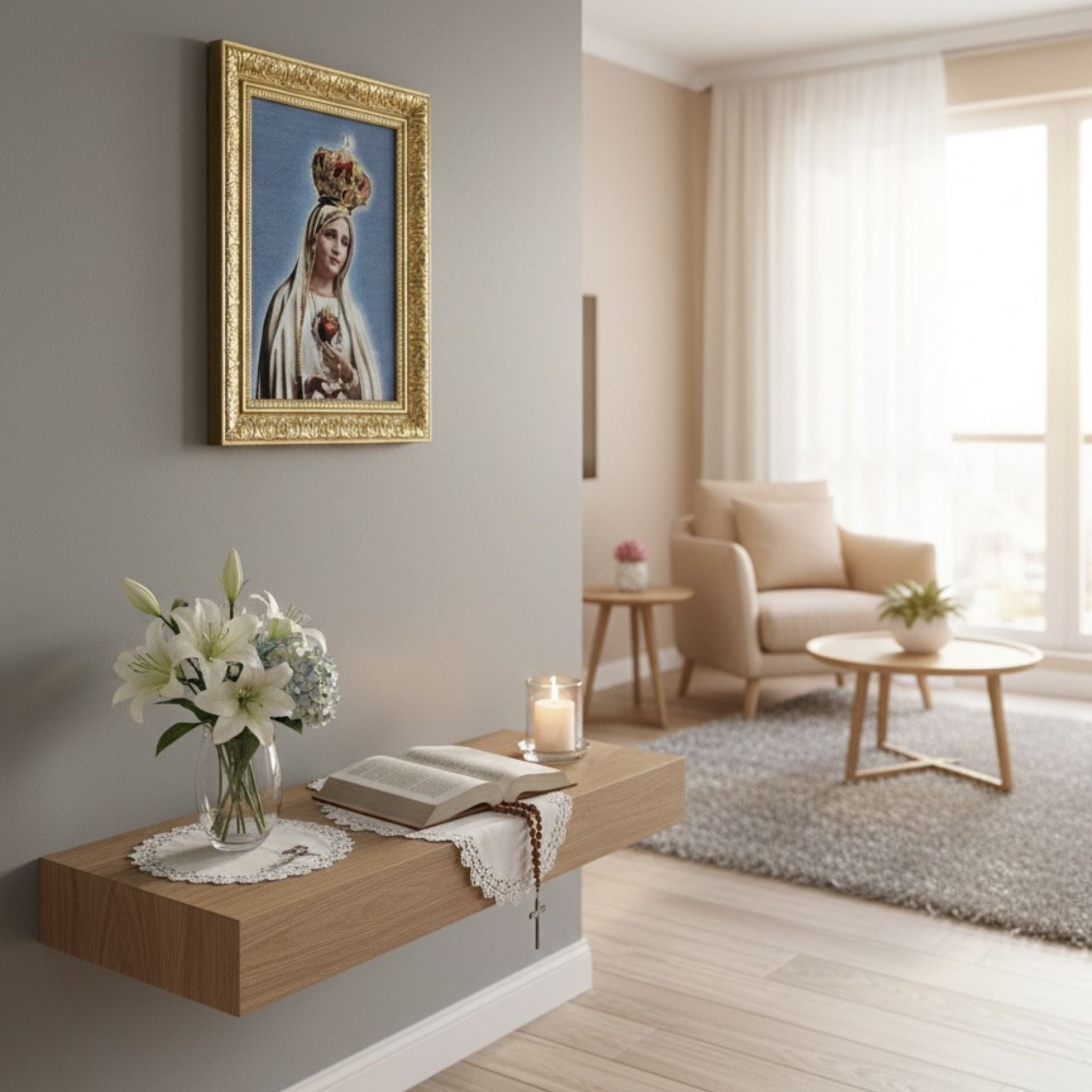 Inspirado en la dulzura y serenidad de la Virgen de Fátima, este cuadro invita a la calma y la oración interior.