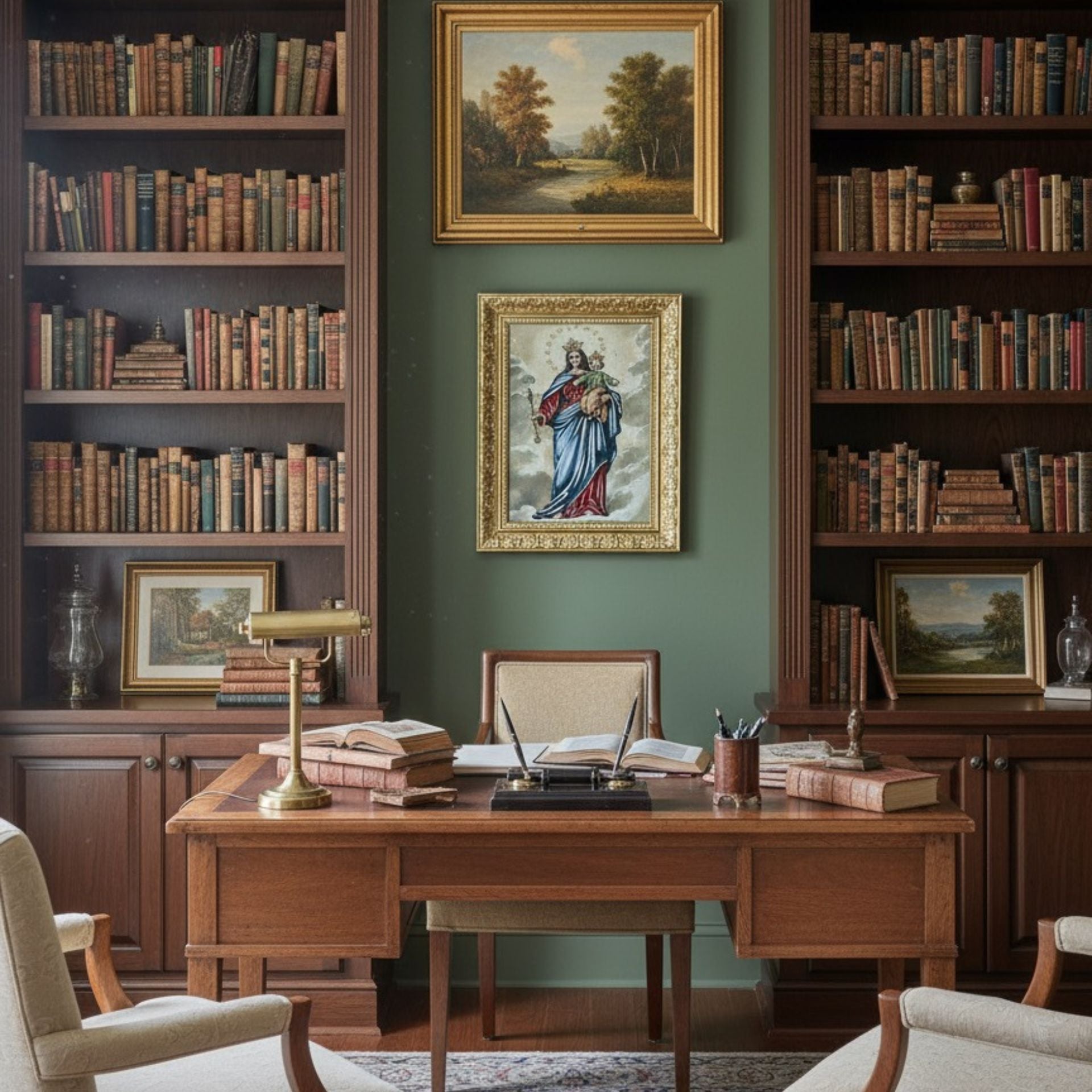 El cuadro, de 40 × 50 cm, combina la calidez del color con el brillo sutil del marco dorado, convirtiéndose en una presencia que acompaña y sostiene desde el hogar.