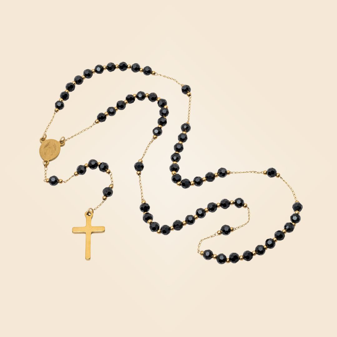 El Rosario Sancredo está elaborado con esferas de vidrio negro facetado y delicados acentos dorados, que reflejan la luz con sutileza.