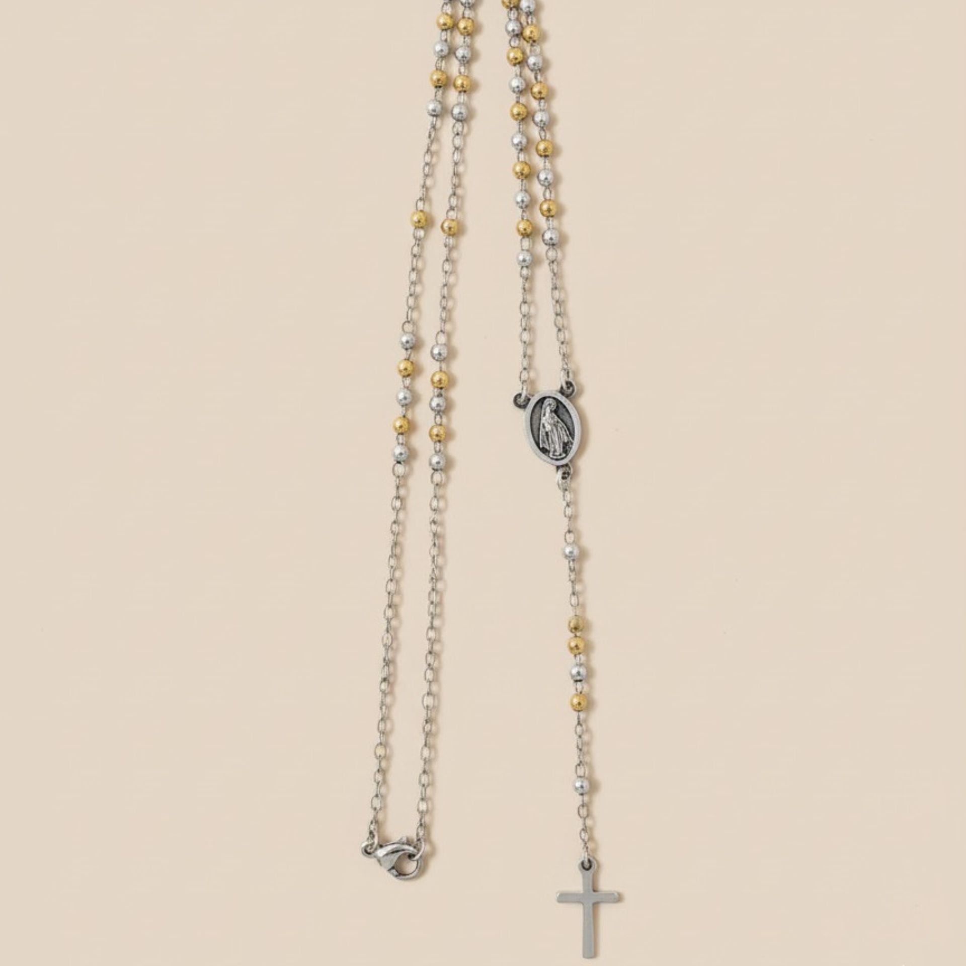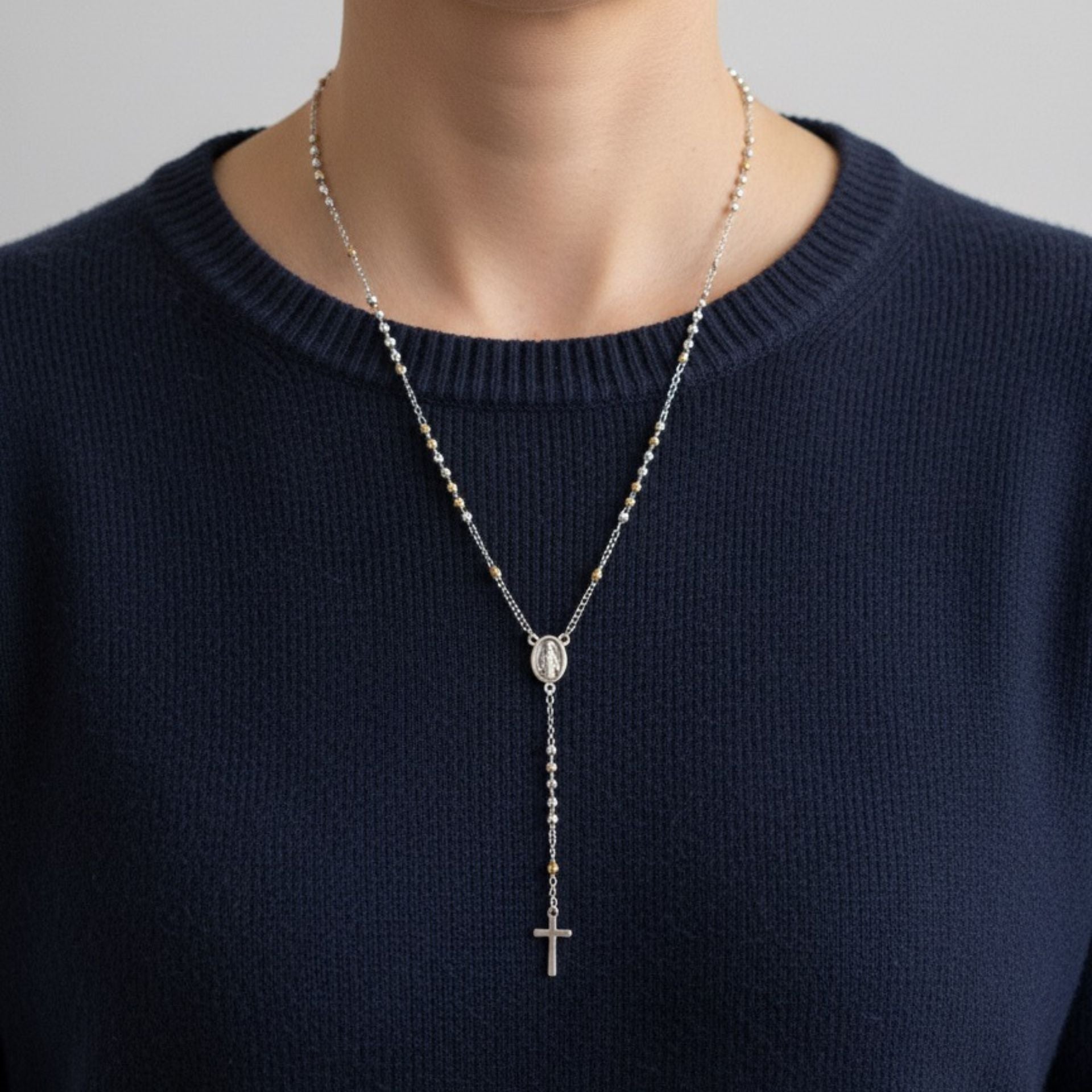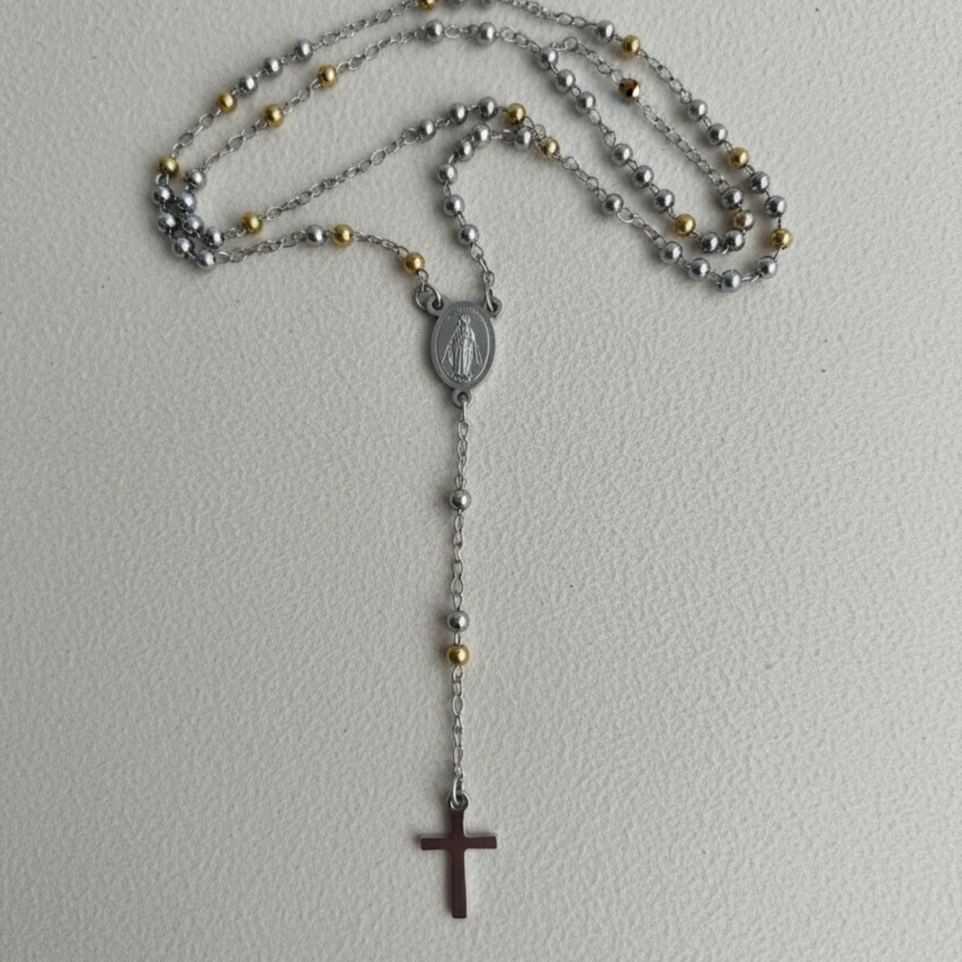 Este rosario combina tonos plateados y dorados en una secuencia equilibrada que simboliza claridad y armonía. Sus cuentas metálicas aportan resistencia sin perder delicadeza, mientras la medalla central añade un toque de devoción serena. Una pieza sobria, versátil y luminosa para llevar contigo en cualquier momento.