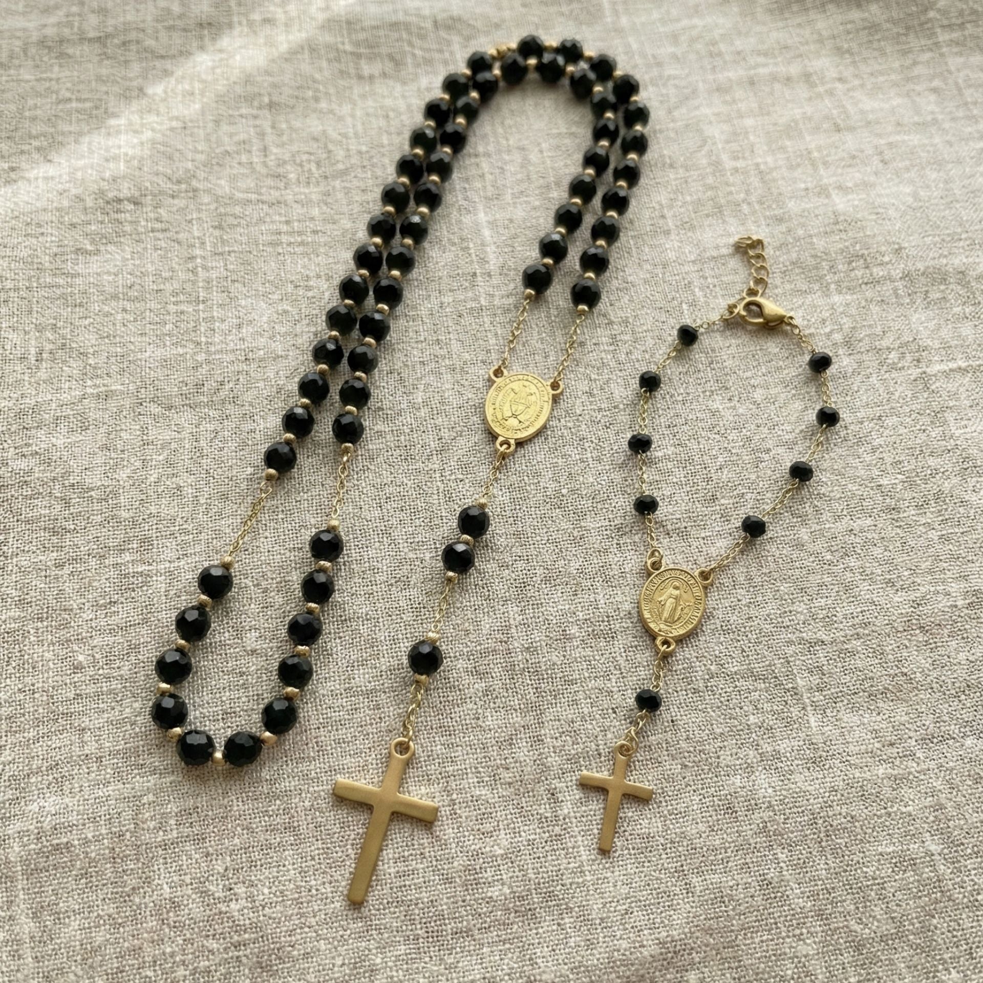 📿 1. Rosario Camino de Luz (47 cm): Una pieza de diseño contemporáneo que combina esferas facetadas de color negro profundo con delicados acentos dorados. Diseñado para tus momentos de intimidad espiritual, su peso y textura te ayudan a centrar la mente en la oración. Es el equilibrio perfecto entre tradición y elegancia moderna.