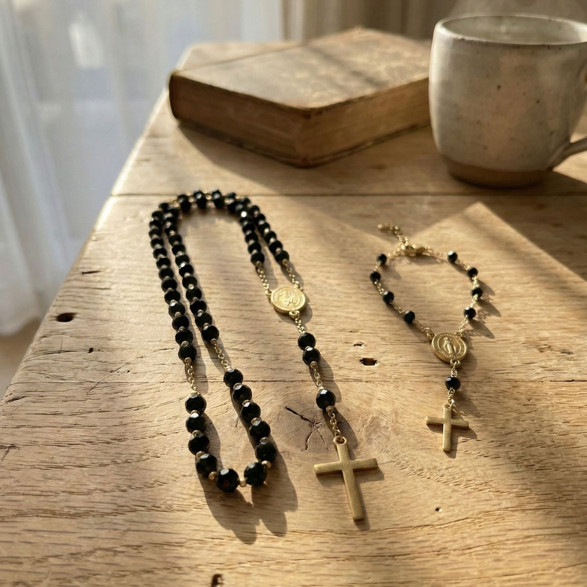 Cuentas de acabado suave y brillante, medallas y cruces con relieves finos. Diseñados para oración, contemplación y como símbolo de devoción para llevar contigo.