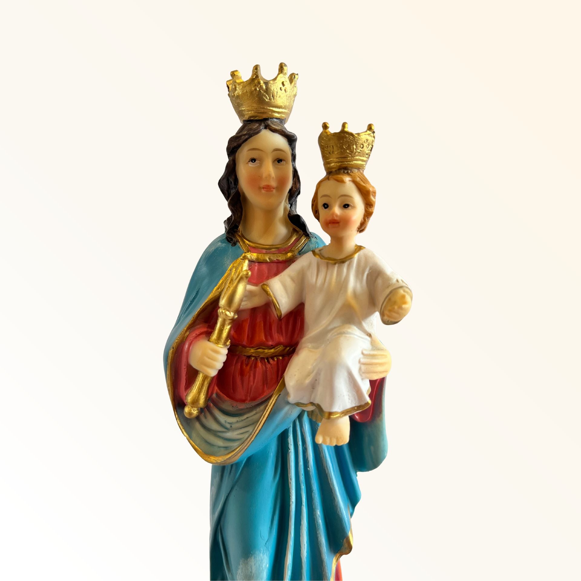 Con su mirada serena y su gesto de bendición, representa el poder del amor maternal.