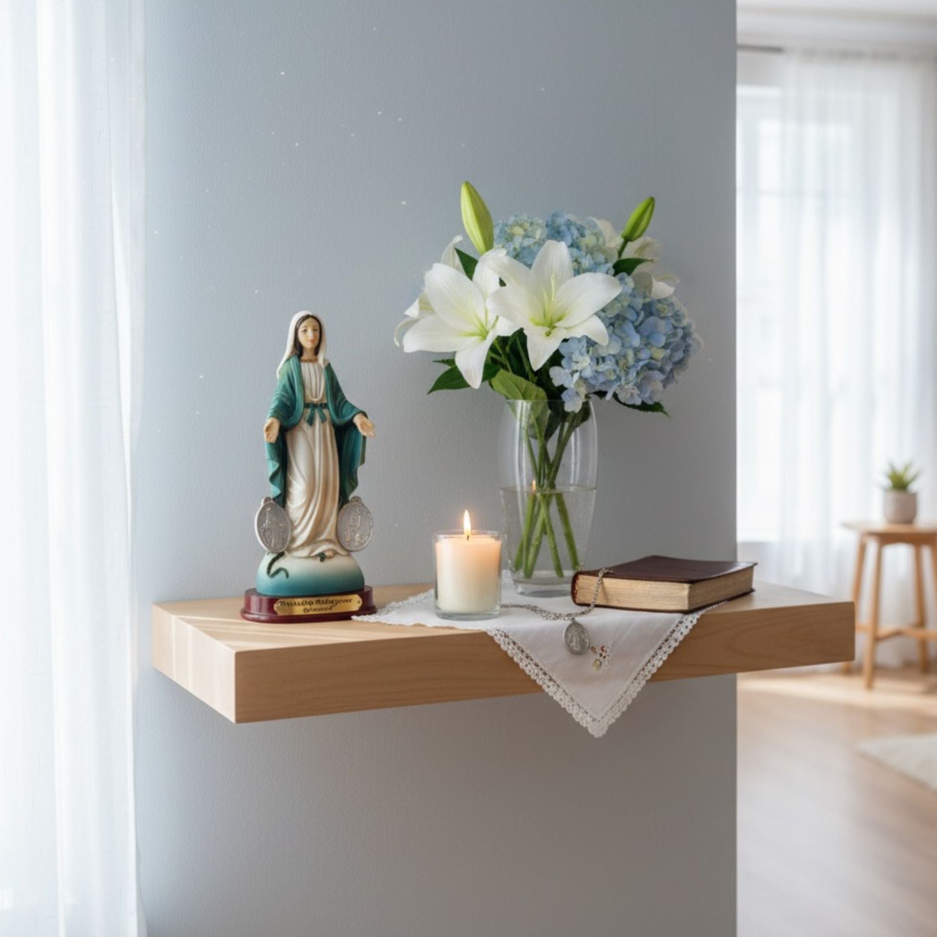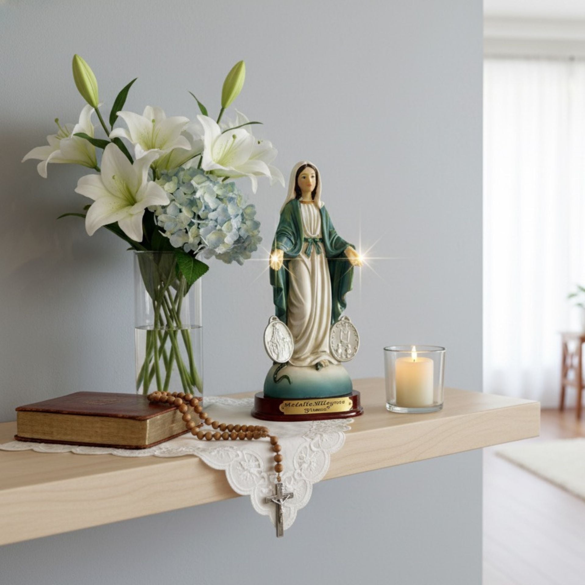 Inspirada en la aparición a Santa Catalina Labouré, la Virgen Milagrosa invita a confiar y abrir el corazón.